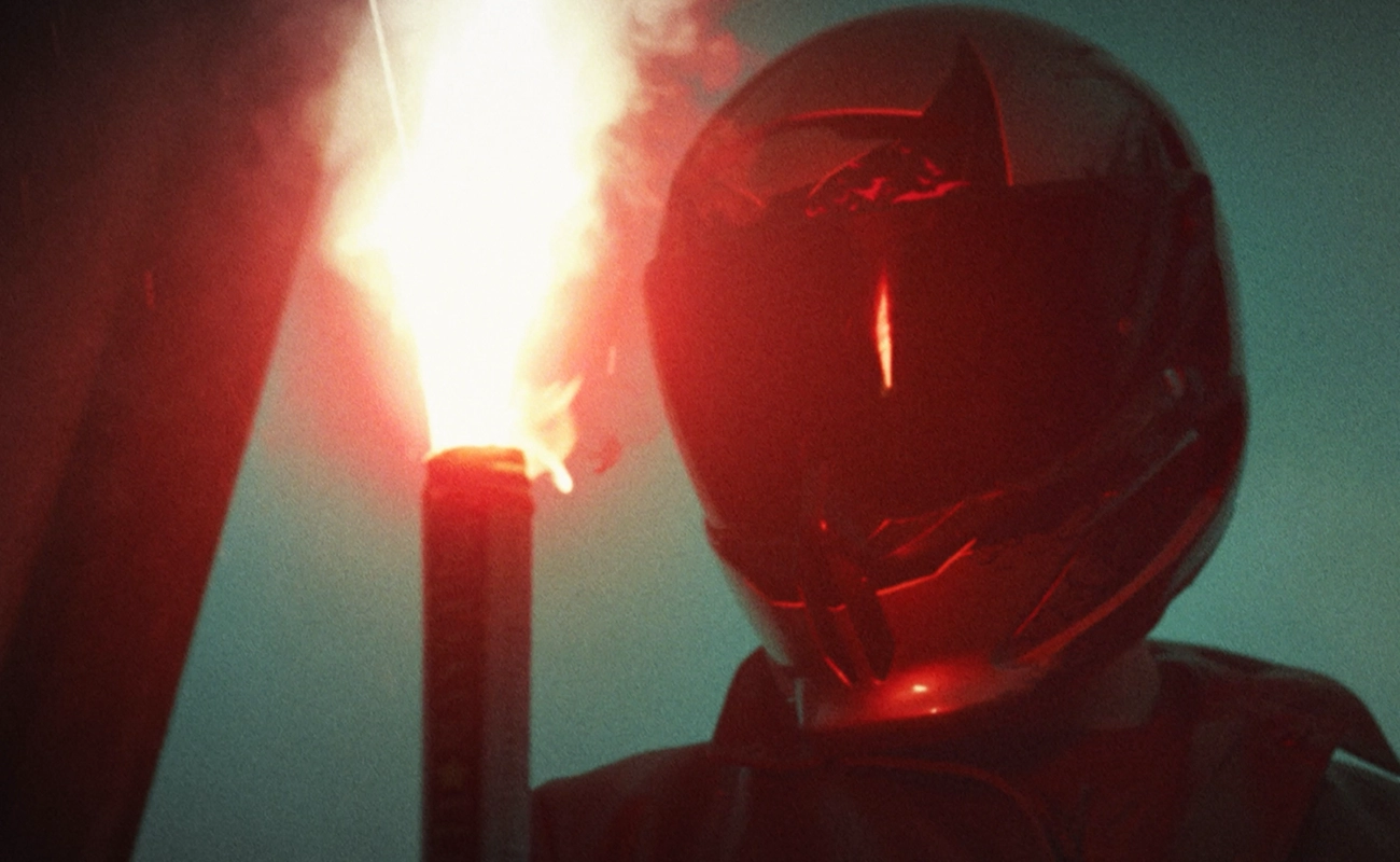 The second sequence, set at Gotham Hotel in Manchester follows the figure walking to a black Harley Davidson and moving through the streets, with shots diving and chasing around city. Smoke from the flare, dusk and night lighting, and the urban backdrop create a dark, Gotham-inspired mood. The final edit was completed by Ruroc